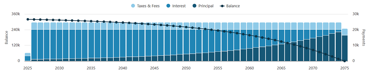 I understand the long-loan appeal. You wouldn't know how to live on my income, but I've got a 20-year, 2.75% loan I took out for home energy efficiency and generation: rooftop solar, more efficient replacements for my end-of-life water heater and furnace. The very low monthly made efficiency and GHG-emission reduction affordable. It pencils out because the interest rate's so low and the drop in my purchased-energy costs is appreciable (my util bill is about $40/mo on average now in a cold continental climate, around a quarter what it was before, inflation-adjusted), and I'd have had needed a loan for at least part of the new equipment anyway, so a long low-interest loan was the best deal going. I am also likely to live in this house for the entire term of the loan.