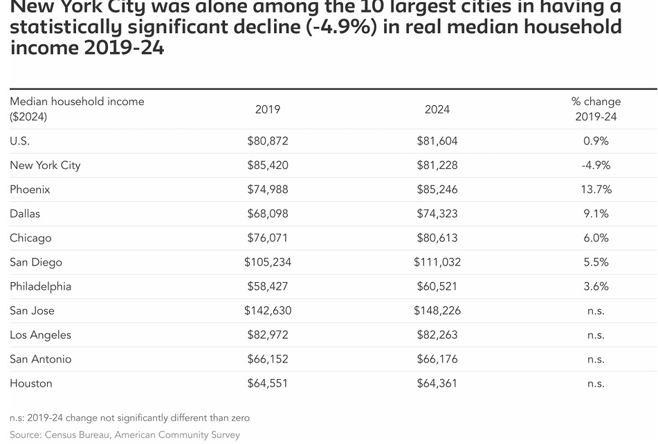 New York City’s problem is unusual. It was the only one of the 10 biggest U.S. cities to experience a sizable decline in inflation-adjusted median household income from 2019 to 2024, according to a report by James Parrott of the New School’s Center for New York City Affairs. Here’s a table from Parrott’s report. (It also appeared in Tooze’s post.)