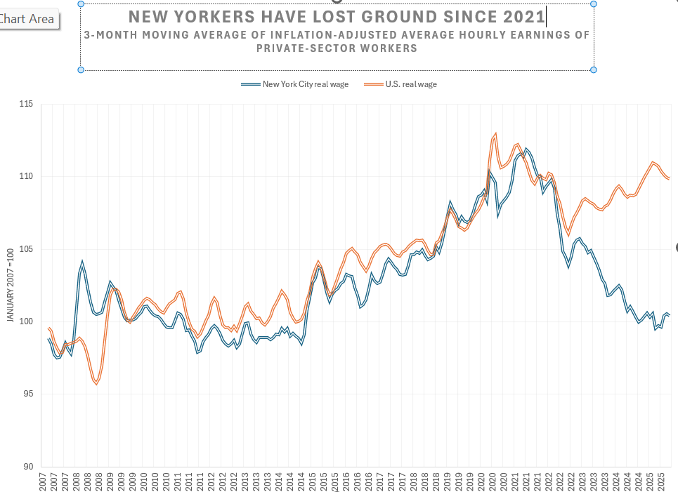 Zohran Mamdani was elected mayor of New York City last week because his relentless emphasis on the high cost of living resonated with many voters. This chart explains why. It shows that inflation-adjusted average hourly earnings of private-sector workers in New York City have fallen almost continuously since the pandemic year of 2021, while the same metric for the United States as a whole stopped falling in 2022 and has since rebounded.